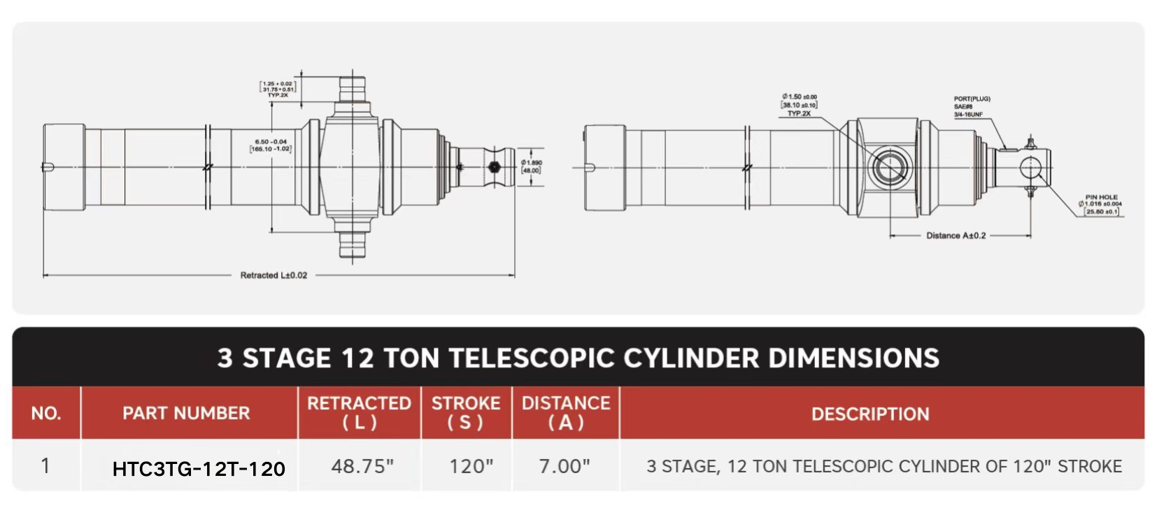 "HTC3TG-12T-120", 3 Stage, 12 Ton Of 120" Stroke Telescopic Cylinders
